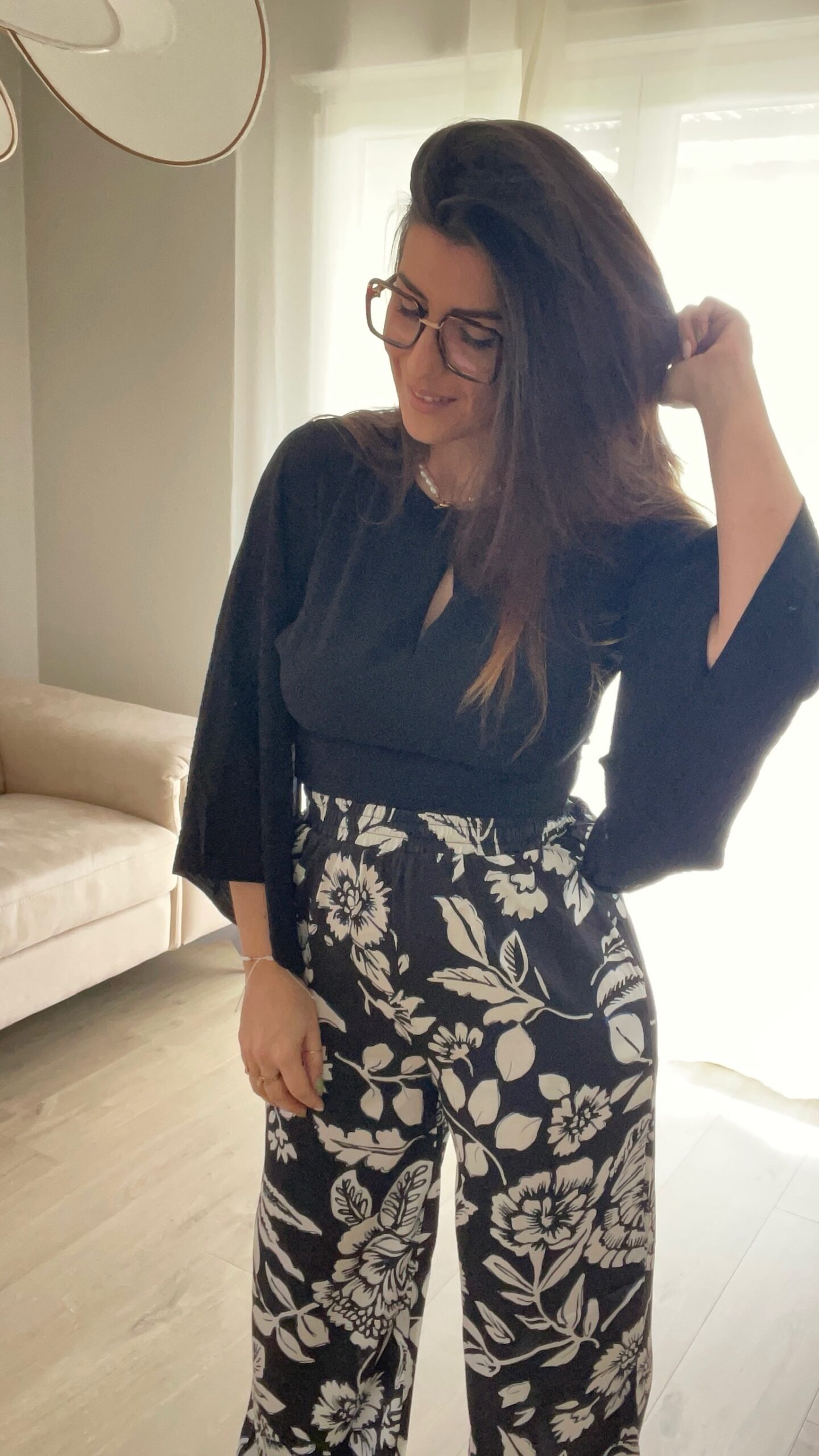 Le tissu de la jupe est noir, ce qui met en valeur les motifs floraux dans des tons chauds de marron, beige, et orangé.