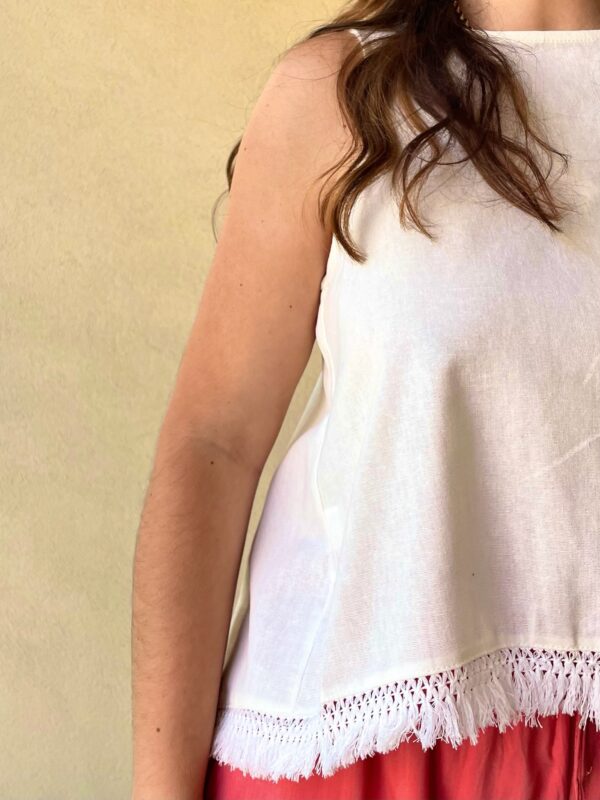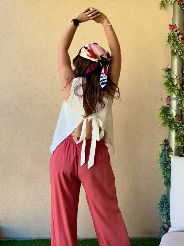 Le top en lin, parfait pour les journées chaudes et ensoleillées. Ce top se noue à l’arrière, laissant apparaître votre dos. On aime beaucoup sa coupe ainsi que sa matière très agréable.
